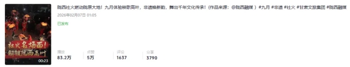 2000万次浏览,169万次点赞,3条百万级播放爆款视频和14条十万+级播放高热视频,这不仅是甘肃文旅集团新媒体账号2026年开局后的简单数字,更是账号与粉丝关系的重塑:从单向输出到双向奔赴,从自我言说到众声和鸣,越来越多的粉丝在后台留言互动,成为甘肃文旅的“民间代言人”。