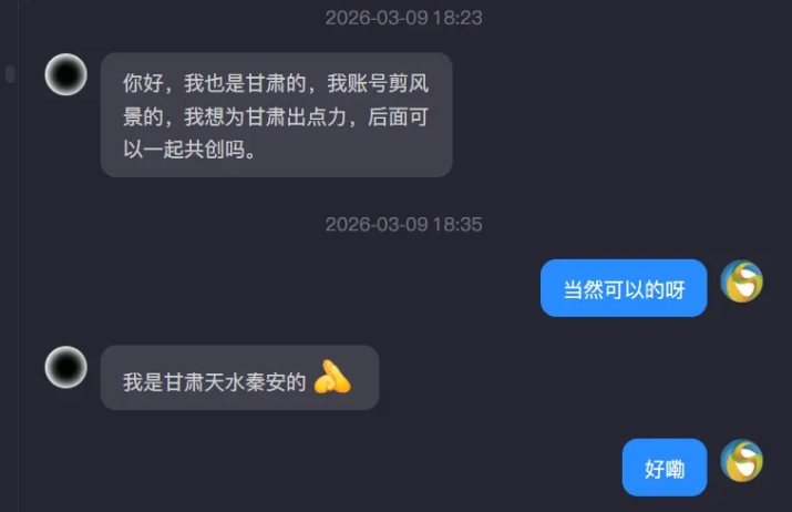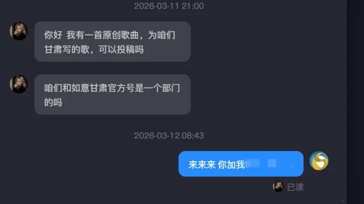 收获2000万曝光的同时,账号和受众关系也悄然转变。过去是账号单向介绍:甘肃文旅集团,成立于2019年,有什么,能给什么?现在,越来越多的人开始主动投稿。他们投稿自己制作的视频,想让更多人看见甘肃;他们发送自己的原创歌曲,想为文旅行业奉献出自己的一份力量,主动联系要“帮甘肃上分”。